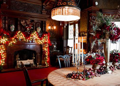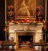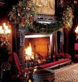 This issue of our Fireplace Design Ideas e-newsletter offers a glimpse of Victorian exuberance in holiday hearth decor. See how one designer met the challenge of creating an elegant, but festive holiday decorating scheme befitting the splendor of a grand Victorian room. Nestled in a secluded hillside setting overlooking New York's Hudson River, Wilderstein is a gracious 19th century country house in Rhinebeck . . . just a short drive from New York City. Each year, this grande dame of Queen Anne architecture in the Hudson Valley is transformed by florists and designers into a Christmas holiday extravaganza. Warm, richly finished paneling and a carved and coffered ceiling lend old world elegance to Wilderstein's formal dining room (below). Not to be outdone, the imposing mantelpiece soars from floor to ceiling. Handcarved and crafted, the wood mantel frames a firebox surround of dark marble. Get Inspired with Visions of Victorian Grandeur Decked out for the holidays by Tess Casey of Aisling Flowers, based in New York City, this holiday hearth evokes the exuberance of a Victorian Christmas. An evergreen garland draped in red fabric festoons the fireplace mantel. Strings of tiny white lights weave their way through the greenery, while bell-shaped ornaments dangle from above. Red roses garnish the evergreen garland to enhance the romantic charm and ambiance of this warm holiday setting! See Victorian Christmas Fireplace Photos of a Gilded Age Icon!