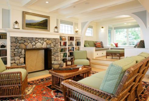 The fireplace pictured below is the focal point of a charming Shingle Style cottage designed by Jarvis Architects on Lake Mendota in Madison, Wis- consin. In addition to a cozy alcove with built-in seating at one end of the room, built-in bookshelves line the wall on either side of this "classic" cottage fireplace design.